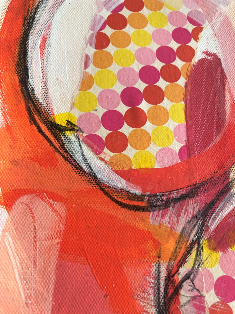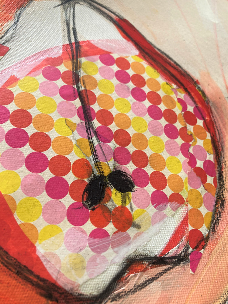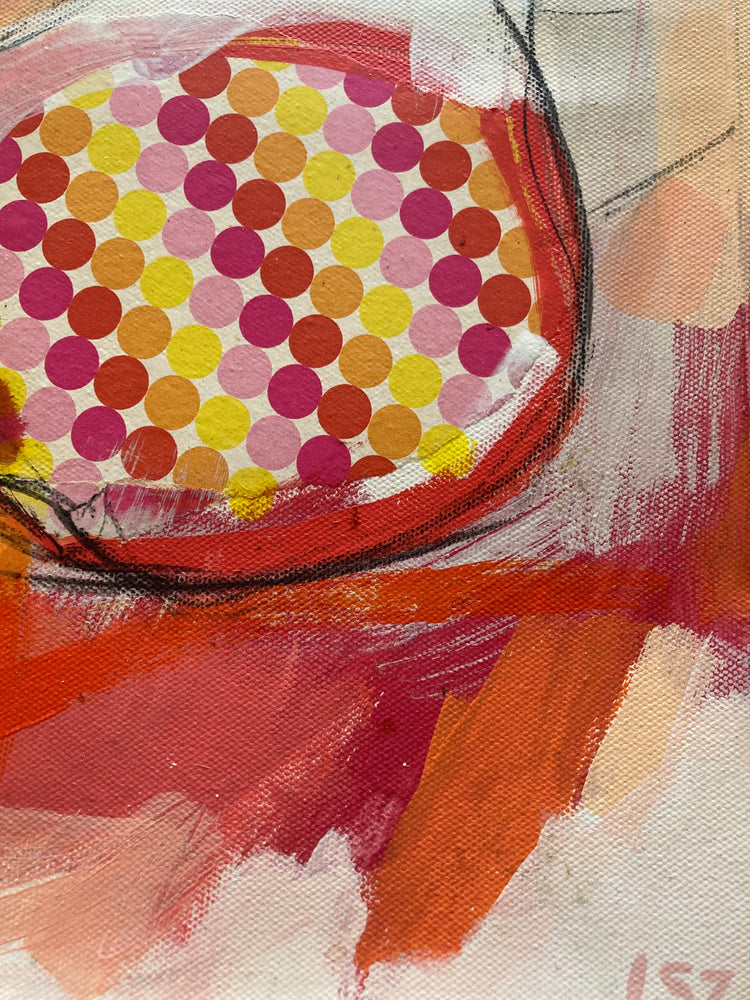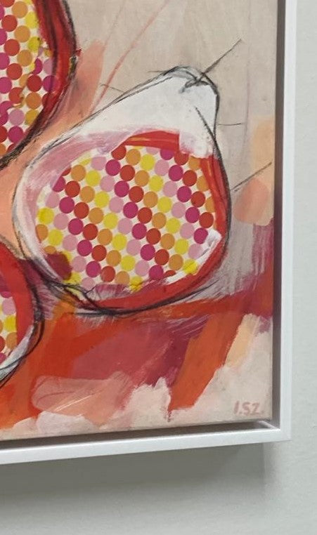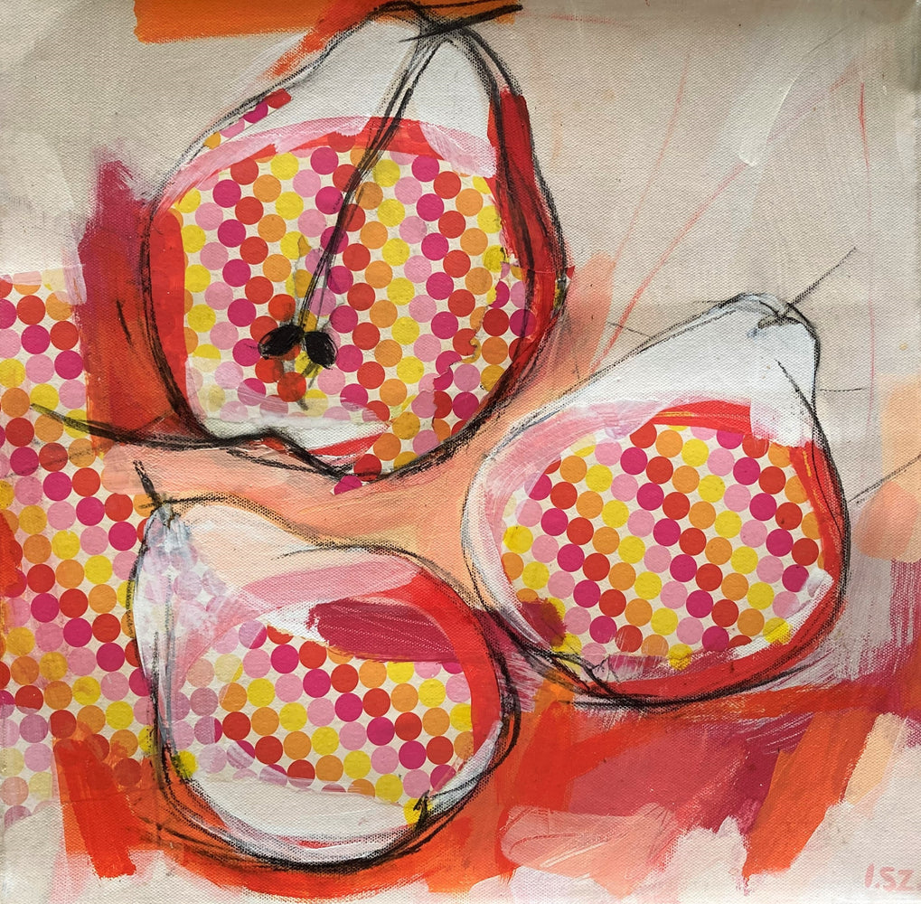 Three free style fruits suggesting “pears” filled with the pattern of a printed paper piece and areas of vivid color. Stretched canvas + float mounting in white